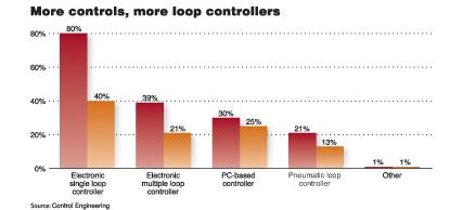 當(dāng)受訪者被問(wèn)及他們更傾向于使用哪些種類的控制器時(shí),80%的受訪者(2005年只占40%)說(shuō)他們使用單一回路控制器,39%的受訪者選擇電子多回路控制器(2005年只占21%),30%的受訪者使用基于PC的控制器(2005年只占25%)。有趣的是,氣動(dòng)回路控制器的使用正持續(xù)增長(zhǎng),相比于2005年的13%,2007年有21%的用戶選擇氣動(dòng)回路控制器。對(duì)于為什么選擇特定的回路控制器,用戶們給出了一系列原因,包括老設(shè)備的延用、操作員的熟練程度等,低廉的成本是最多被提及的原因。使用獨(dú)立回路控制器的一個(gè)不得已的原因是考慮到獨(dú)立顯示和設(shè)置控制能提供一定程度的安全系數(shù)(一個(gè)故障不會(huì)影響到其它回路)以及考慮到不同用途的信號(hào)的調(diào)制整合。受訪者說(shuō),如果需要的話,通訊選項(xiàng)仍舊允許集中監(jiān)控和控制。