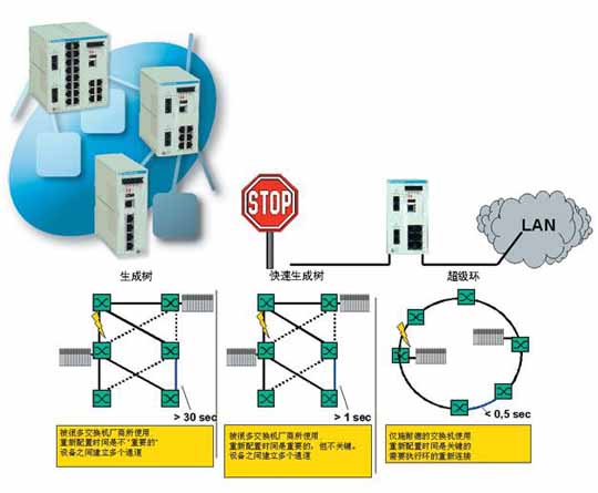 注:在時(shí)間關(guān)鍵性應(yīng)用中,使用快速生成樹(shù) (RSTP)協(xié)議,在原路徑斷開(kāi)的情況下,重新配置時(shí)間在1秒內(nèi)即可完成。而生成樹(shù)需要一分種到幾分鐘,它可以用于IT行業(yè),是一個(gè)較早協(xié)議。