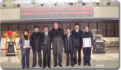慕冠達(dá)先生與楊澤先生就OEM戰(zhàn)略合作及SIVACON 8PT-4000許可制造進(jìn)行了友好、富有成效的會(huì)談,雙方一致認(rèn)為加強(qiáng)、加快合作符合雙方的根本利益。太原通澤成套設(shè)備有限公司在機(jī)械制造、液壓潤(rùn)滑系統(tǒng)、配電柜及成套電氣控制系統(tǒng)中大量引入西門子全集成自動(dòng)化概念(TIA),使通澤公司的產(chǎn)品從技術(shù)含量上在無(wú)縫鋼管行業(yè)達(dá)到國(guó)內(nèi)先進(jìn)水平。友好熱烈的會(huì)談之后,慕冠達(dá)先生與楊澤先生在通澤門前的石象下進(jìn)行留影,同時(shí)祝愿通澤公司的業(yè)務(wù)如大象一樣健康成長(zhǎng),一旦邁開(kāi)步伐便有勢(shì)不可擋之發(fā)展前景。 然后,慕冠達(dá)先生為太原通澤成套設(shè)備有限公司頒發(fā)了OEM戰(zhàn)略合作伙伴及SIVACON 8PT-4000許可制造授牌。