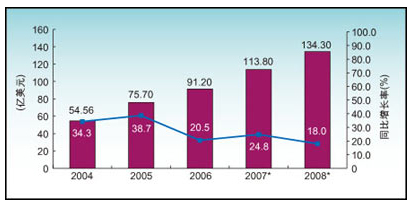 據(jù)信息產(chǎn)業(yè)部統(tǒng)計(jì),中國(guó)大陸今年1~10月份,已生產(chǎn)半導(dǎo)體分立器件1,995億只,同比增長(zhǎng)12.0%,產(chǎn)品銷售收入同比增長(zhǎng)20.0%,達(dá)720億元。預(yù)計(jì)到今年年底,產(chǎn)量可達(dá)2,500億只左右,產(chǎn)品銷售收入可達(dá)865億元人民幣,從2004~2007年,中國(guó)大陸本地半導(dǎo)體分立器件產(chǎn)品銷售收入年復(fù)合增長(zhǎng)率達(dá)27.8%。預(yù)計(jì)2008年,在中國(guó)電子制造業(yè)前景看好的形勢(shì)下,將以18.0%的速度增長(zhǎng),產(chǎn)品銷售收入將達(dá)到134.3億美元(見(jiàn)圖1)。