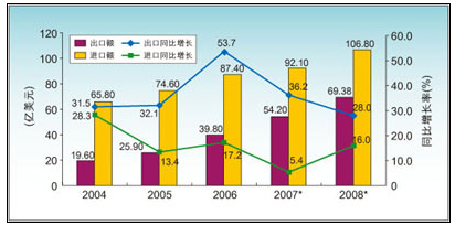 2007年中國(guó)大陸半導(dǎo)體分立器件仍呈現(xiàn)“大進(jìn)大出”的特點(diǎn),進(jìn)口遠(yuǎn)大于出口,進(jìn)口額為出口額的1.7倍,但其本地生產(chǎn)和出口能力正在逐年提升。據(jù)海關(guān)數(shù)據(jù)統(tǒng)計(jì),2007年1~10月份,中國(guó)大陸半導(dǎo)體分立器件進(jìn)口總額為126.55億美元。按此增長(zhǎng)幅度計(jì)算,到今年年底將達(dá)151.86億美元,同比增長(zhǎng)15.3%。與此同時(shí),1~10月份出口總額為77.83億美元,按此增長(zhǎng)幅度計(jì)算,到今年年底將達(dá)93.4億美元,同比增長(zhǎng)52.1%(這里進(jìn)出口額中包括所有貿(mào)易方式和國(guó)貨復(fù)進(jìn)口部分,見(jiàn)圖2)。進(jìn)口平均價(jià)格為0.055美元,出口平均價(jià)格為0.038美元。