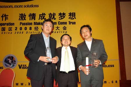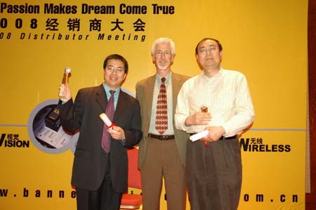 最后美國(guó)邦納總部副總裁Bob Schlicksup先生與大中華區(qū)董事總經(jīng)理胡勇先生向2007年取的優(yōu)秀業(yè)績(jī)的經(jīng)銷(xiāo)商頒獎(jiǎng),現(xiàn)場(chǎng)氣氛達(dá)到高潮。與會(huì)者堅(jiān)信通過(guò)邦納公司和各經(jīng)銷(xiāo)商們的強(qiáng)強(qiáng)聯(lián)合美國(guó)邦納在2008年將會(huì)以更先進(jìn)、更優(yōu)異、更嶄新的姿態(tài)翱翔在中國(guó)自動(dòng)化產(chǎn)業(yè)傳感器領(lǐng)域的天空。