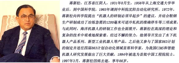 我國工業(yè)機器人起步于70年代初期,經(jīng)過三十多年的發(fā)展,大致經(jīng)歷了4個階段,70年代的萌芽期,80年代的開發(fā)期,90年代的適用化期和兩千年后的高速發(fā)展期。提到了中國機器人事業(yè)的發(fā)展,我們就不得不提一個人,蔣新松,被譽為中國機器人之父。1997年6月18日,中國6000米水下自動機器人的試驗應用成功,標志著中國在自動化領域已邁上90年代世界先進水平。然而,被譽為“中國機器人之父”的蔣新松,卻沒能等到這激動人心的時刻......