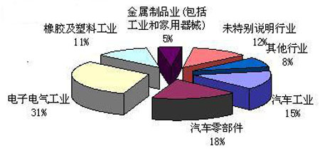 亞洲地區(qū)各主要行業(yè)對工業(yè)機器人需求比例分布圖