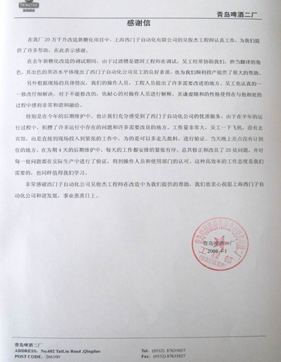 與此同時(shí),西門(mén)子工程師吳俊杰也得到了青島啤酒二廠的特別感謝。青島啤酒二廠給吳公工的感謝信里說(shuō),吳工在青島啤酒二廠20萬(wàn)千升改造新糖化項(xiàng)目中不僅擔(dān)當(dāng)了良好的翻譯,還認(rèn)真的幫助那里的工程人員解決了操作中的難題。在后期維護(hù)中,吳工也高效率的解決了許多機(jī)器運(yùn)行中存在的問(wèn)題和需要改良的地方,為該公司避免了不必要的損失。