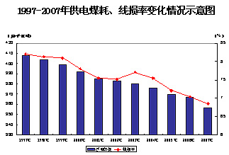 2007年,全國供電煤耗(6000千瓦及以上電廠供電標(biāo)準(zhǔn)煤耗)為357克/千瓦時,比2006年降低10克/千瓦時。發(fā)電標(biāo)準(zhǔn)煤耗334克/千瓦時,同比下降9克/千瓦時,為近幾年下降幅度最大的一年,相當(dāng)于全年6000千瓦以上火電廠生產(chǎn)節(jié)約標(biāo)煤2423萬噸,占全年發(fā)電耗用標(biāo)煤量的2.75%。電網(wǎng)輸電線路損失率比上年減少0.19個百分點,降為6.85%。