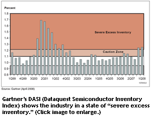 The market research company in March forecasted that excess inventory in the electronics supply chain from a poor Q4 2007 could continue to impact the semiconductor industry through Q2. Gartner made that statement based on the performance of its Dataquest Semiconductor Inventory Index (DASI), which spiked significantly in Q4, to 1.16 from 1.04 in Q3 2007 on lackluster semiconductor "holiday sales" and lowered expectations for sales in Q1.