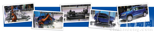 生產(chǎn)線上展出了一個(gè)尚未涂漆的車體,有機(jī)器手在做焊接的動作。它演示了在實(shí)際的生產(chǎn)設(shè)施中,如何借助于機(jī)器人將Tiguan的車頂放置到合適的位置。一套完善的自動化裝置為所有組件的集成過程提供支持。