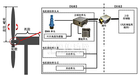 穆格該控制系統(tǒng)的組成部分包括:實際改變?nèi)~片角度的“機電作動(EMA)單元”、控制EMA單元的“從動單元”、相當(dāng)于整個系統(tǒng)指令部的“主驅(qū)動單元”、用于連接主驅(qū)動單元與上位控制器的“滑環(huán)”,以及檢測葉片角度的傳感器等。從動單元與主驅(qū)動單元安裝在支撐葉片的輪轂內(nèi)部,與葉片一同轉(zhuǎn)動。滑環(huán)可作為與轉(zhuǎn)動的主驅(qū)動單元連接的機構(gòu)。