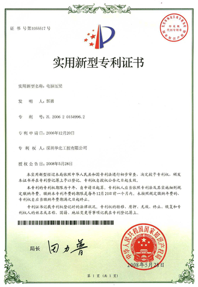 華北工控電腦壓梁獲知識產(chǎn)權(quán)局實(shí)用新型專利證書