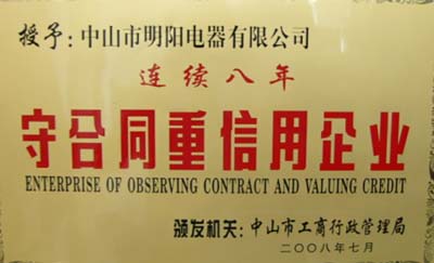 導語:中山明陽電器連續(xù)八年榮獲中山市"守合同重信用企業(yè)"榮譽稱號