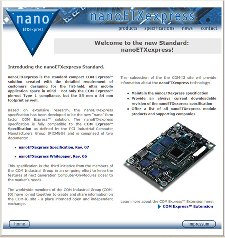 導語:控創(chuàng)新款袖珍模塊規(guī)格專業(yè)網(wǎng)站正式啟用,該網(wǎng)站為nanoETXexpress 嵌入式計算機模塊專業(yè)網(wǎng)站,nanoETXexpress 嵌入式計算機模塊是為開發(fā)超小型移動袖珍設(shè)備而推出的