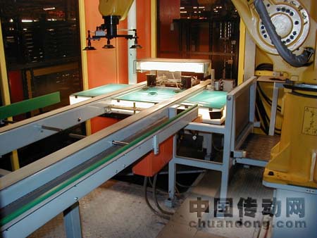 機(jī)器人根據(jù)視覺系統(tǒng)提供的數(shù)據(jù)定位玻璃,通過一個(gè)向玻璃邊線連續(xù)滴加樹脂的固定噴嘴,操縱玻璃邊線,并最終將玻璃傳送至操作員進(jìn)行挑選的卸載位置,以適應(yīng)車輛情況。坐標(biāo)系由線上機(jī)器人直接定位和替換,以便其它機(jī)器人能準(zhǔn)確獲取到玻璃。