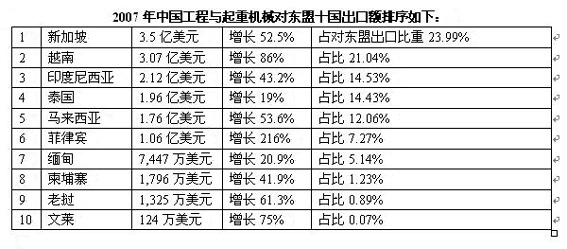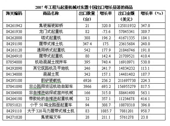 導(dǎo)語:近年中國積極發(fā)展與東盟十國經(jīng)貿(mào)合作關(guān)系,在原來長期交往和傳統(tǒng)貿(mào)易基礎(chǔ)上,雙邊進(jìn)出口貿(mào)易得到快速發(fā)展。同時在東盟十國經(jīng)濟(jì)加速發(fā)展及重視基礎(chǔ)設(shè)施建設(shè)過程中,為中國工程與起重機(jī)械出口提供了難得的發(fā)展機(jī)遇。