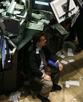 恐慌性的拋盤造成周一最高時(shí)約有二點(diǎn)五萬(wàn)億美元市值蒸發(fā)殆盡,紐約證券交易所和納斯達(dá)克交易所當(dāng)天共有五千三百多只股票下跌。相比二00七年十月高峰時(shí),股指下跌了約百分之三十。