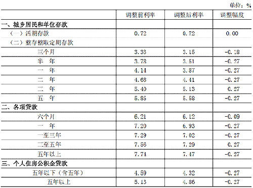 從2008年9月16日起,下調(diào)一年期人民幣貸款基準(zhǔn)利率0.27個百分點,其他期限檔次貸款基準(zhǔn)利率按照短期多調(diào)、長期少調(diào)的原則作相應(yīng)調(diào)整;存款基準(zhǔn)利率保持不變。