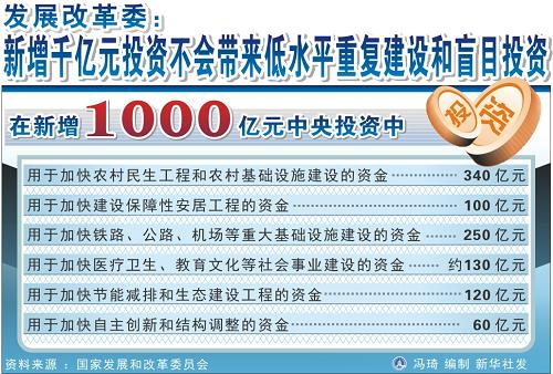 國家發(fā)展改革委有關負責人24日說,新增1000億元中央投資將主要用于保障民生、農村和交通等公共基礎設施、節(jié)能減排和生態(tài)建設等項目。通過加強管理、聯(lián)合督查等方式,可以保證工程質量,防止產(chǎn)生“豆腐渣工程”、低水平重復建設和盲目投資。