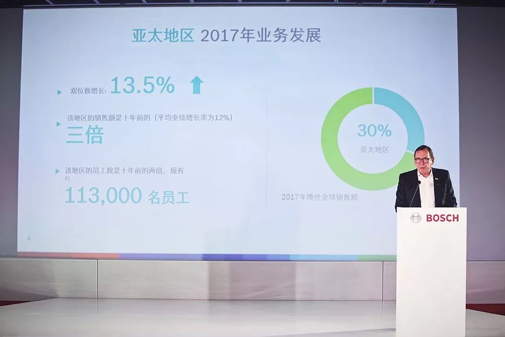 “作為集團(tuán)在德國以外的最大單一市場(chǎng),博世中國在2017年為整個(gè)亞太市場(chǎng)貢獻(xiàn)了超過60%的銷售業(yè)績?!辈┦兰瘓F(tuán)董事會(huì)成員、亞太區(qū)業(yè)務(wù)負(fù)責(zé)人泰瑞來表示。而整個(gè)亞太地區(qū)的銷售收入占到全球業(yè)績的30%。