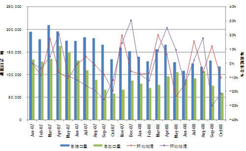 從進出口統(tǒng)計數(shù)據(jù)來看,國家針對不銹鋼產(chǎn)品進出口政策的調(diào)整顯然對08年不銹鋼進出口尤其是出口量產(chǎn)生了很大的影響,08年5月份后由于進出口訂單的延緩執(zhí)行,進出口量并未明顯減少,而10月份不銹鋼進出口量開始明顯減少,從08年前10月統(tǒng)計數(shù)據(jù)來看,進出口的主要品種板卷、碎料、帶材、管材同比均有不同程度的減少,這也充分反應了國內(nèi)不銹鋼需求的疲弱形勢。