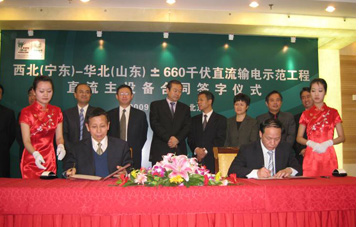 導(dǎo)語:3月12日,由國家電網(wǎng)公司組織的西北(寧東)-華北(山東)±660千伏直流輸電示范工程直流主設(shè)備合同簽字儀式在京隆重舉行。