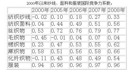 隨著紡織企業(yè)在自主創(chuàng)新和品牌發(fā)展上有長足的進步,從紗線、面料和服裝出口情況看,國際競爭力正不斷提高。這可以從這三大產(chǎn)品競爭力系數(shù)的變化情況看出。
