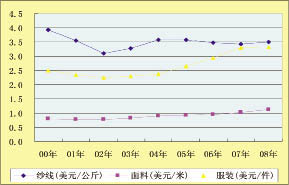 據(jù)我國海關(guān)統(tǒng)計,2008年我國紗線出口221.94萬噸,比上年同期增長2.24%;出口金額77.70億美元,比上年同期增長4.82%;平均單價3.5美元/公斤,比上年同期增長2.34%。2008年我國面料出口185.787億米,比上年同期增長3.33%;出口金額207.62億美元,比上年同期增長13.32%,;平均單價1.12美元/米,比上年同期增長9.8%。2008年我國服裝出口295.52億件,比上年同期下降0.37%;出口金額982.50億美元,比上年同期增長0.67%;平均單價3.32美元/米,比上年同期增長0.91%。