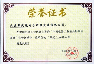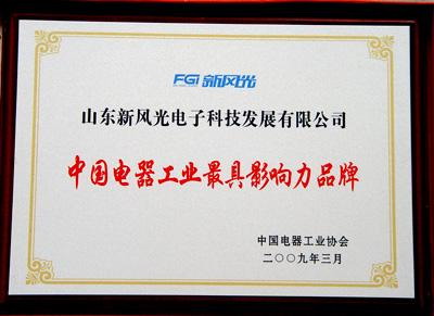 2009年3月27日,在蘇州在水一方酒店召開的中國(guó)電器工業(yè)協(xié)會(huì)第三屆理事會(huì)第五次會(huì)議上,山東新風(fēng)光電子科技發(fā)展有限公司被授予“中國(guó)電器工業(yè)最具影響力品牌”稱號(hào)。