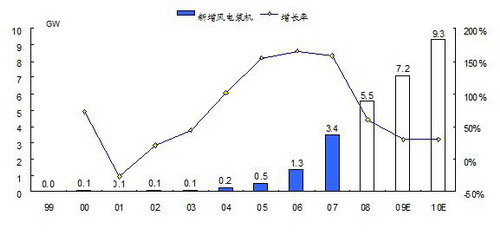 2009~2010年國(guó)內(nèi)新增風(fēng)電裝機(jī)將保持年均30%增長(zhǎng)