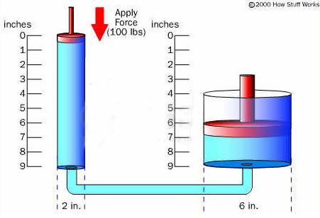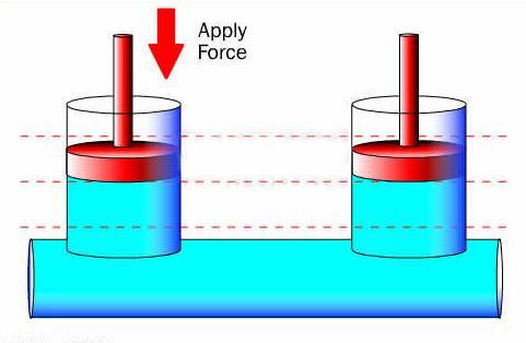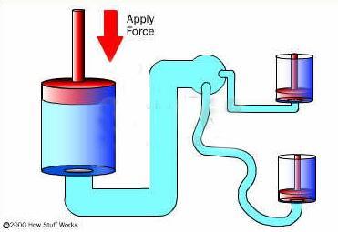 如圖:兩個活塞(紅色)裝在充滿油(藍(lán)色)的玻璃圓桶中,之間由一個充滿油的導(dǎo)管連接,如果你施一個向下的力給其中一個活塞(圖中左邊的活塞)那么這個力可以通過管道內(nèi)的液壓油傳送到第二個活塞。由于油不能被壓縮,所以這種方式傳遞力矩的效率非常高,幾乎100%的力傳遞給了第二個活塞。液壓傳力系統(tǒng)最大的好處就是可以以任何長度,或者曲折成各種形狀繞過其他部件來連接兩個圓桶型的液壓缸。還有一個好處就是液壓管可以分支,這樣一個主缸可以被分成多個副缸,如圖所示: