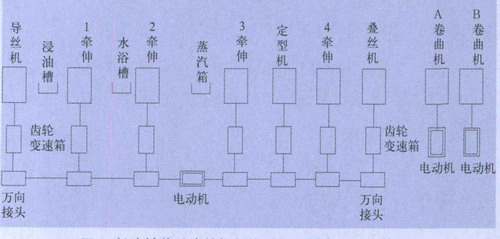 由于紡織品的品種不斷增加,提高紡織產(chǎn)品質(zhì)量的要求日益增長(zhǎng),同時(shí),降低勞動(dòng)強(qiáng)度的呼聲日漸增強(qiáng),不少紡機(jī)由單電機(jī)傳動(dòng)改為多電動(dòng)機(jī)傳動(dòng),例如傳統(tǒng)梳棉機(jī)僅道夫是變速運(yùn)行,而新型梳棉機(jī)已改為5臺(tái)電動(dòng)機(jī)變速傳動(dòng)除道夫外錫林給棉羅拉、蓋板清潔輥,圈條器均改為單獨(dú)電動(dòng)機(jī)變速傳動(dòng)粗紗機(jī)也改為7臺(tái)電動(dòng)機(jī)分別傳動(dòng)錠翼,牽引羅拉,筒管和龍筋升降。滌綸短纖維后加工聯(lián)合機(jī)從導(dǎo)絲機(jī)到四道牽伸機(jī)也由單電動(dòng)機(jī)加長(zhǎng)邊軸和齒輪變速箱傳動(dòng)改為臺(tái)電動(dòng)機(jī)分別傳動(dòng)導(dǎo)絲1、2、3和4道牽伸機(jī)以及緊張熱定型機(jī)和疊絲機(jī), 圖1, 為長(zhǎng)邊軸傳動(dòng)示意圖,圖2為多電動(dòng)機(jī)傳動(dòng)系統(tǒng)方框圖。
