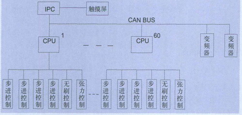 每錠設(shè)有單錠CPU控制器控制該錠接頭程序, 運(yùn)轉(zhuǎn)速度和紗線張力上位機(jī),采用工業(yè)計(jì)算機(jī)IPC, 并配有17英寸觸摸屏監(jiān)控紗線質(zhì)量、筒子防疊、紗線張力、打結(jié)循環(huán)程序以及吸風(fēng)電動(dòng)機(jī)等工作狀況、數(shù)據(jù)統(tǒng)計(jì)和工藝參數(shù)設(shè)定、顯示等全機(jī)采用CAN現(xiàn)場(chǎng)總線控制系統(tǒng)(FCS)如圖3所示。