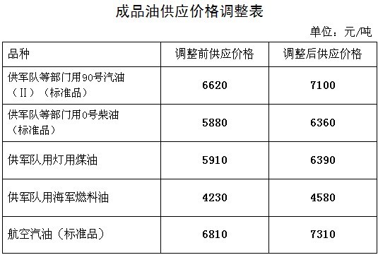 成品油生產(chǎn)經(jīng)營企業(yè)供軍隊及新疆生產(chǎn)建設(shè)兵團、國家儲備用汽、柴油(標準品,下同)供應(yīng)價格每噸均提高480元,調(diào)整后的汽、柴油供應(yīng)價格分別為每噸7100元和6360元。其他成品油價格相應(yīng)調(diào)整。非標準品價格由成品油生產(chǎn)經(jīng)營企業(yè)按照國家規(guī)定的品質(zhì)比率確定。