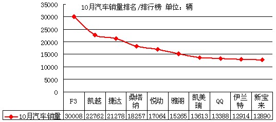 導(dǎo)語:2009年10月,轎車銷量排名前十位的品牌依次是:F3、凱越、捷達、桑塔納、悅動、雅閣、凱美瑞、QQ、伊蘭特和新寶來。