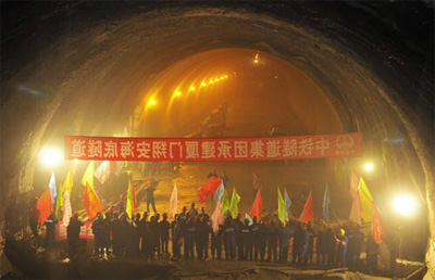 廈門翔安海底隧道是中國完全自主設(shè)計、施工第一條海底隧道,建設(shè)歷時4年多。該隧道全長8.695千米,由兩條行車主洞和一條服務(wù)中孔構(gòu)成。主洞寬17.2米,高12米,可同時行駛3車,隧道最深在海平面下約70米,設(shè)計使用壽命100年。該隧道貫通后,廈門島與翔安區(qū)的車程將由1個半小時,縮短至8分鐘,大大推動海峽西岸經(jīng)濟區(qū)的開發(fā)建設(shè);同時對于探索適合我國國情的海底隧道建造技術(shù),為類似工程的動工興建,具有里程碑式的意義。