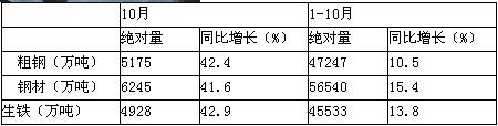 導(dǎo)語:國家統(tǒng)計局數(shù)據(jù)顯示,由于去年同期水平低,10月份國內(nèi)鋼鐵產(chǎn)量同比增長均超過40%,創(chuàng)下近年新高。其中粗鋼產(chǎn)量達到5175萬噸。
