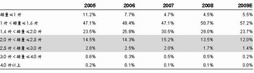 不同排量乘用車產(chǎn)品銷量比重的變化趨勢(shì)