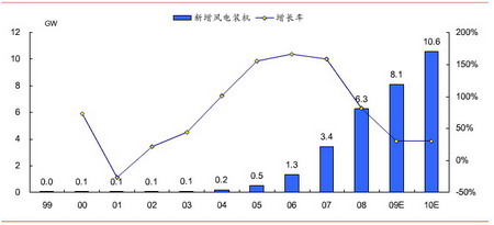 下圖為中國(guó)風(fēng)電新增裝機(jī)量圖,由該圖可知,2008 年中國(guó)新增風(fēng)電裝機(jī)量大約為6.3GW,增長(zhǎng)率為89%,根據(jù)發(fā)改委的新能源規(guī)劃,2009 年新增風(fēng)電裝機(jī)量大約為8.1GW,增長(zhǎng)率為29%,伺服的應(yīng)用與新增風(fēng)電裝機(jī)量基本同比例變化,因此預(yù)計(jì)風(fēng)電行業(yè)伺服的增長(zhǎng)率也大約是29%。