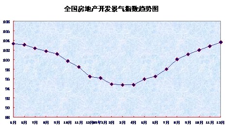 12月份,全國房地產(chǎn)開發(fā)景氣指數(shù)(簡稱“國房景氣指數(shù)”)為103.66,比11月份提高0.88點。