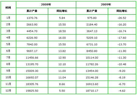 2009 年1~12 月,我國(guó)累計(jì)生產(chǎn)交流電動(dòng)機(jī)18710.17 萬(wàn)千瓦,同比增長(zhǎng)-4.62%,增幅比上年同期下降了10.12 個(gè)百分點(diǎn)。
