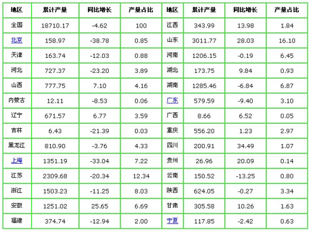 圖表 2 2009 年1~12 月我國(guó)交流電動(dòng)機(jī)分地區(qū)累計(jì)產(chǎn)量及同比增長(zhǎng)情況