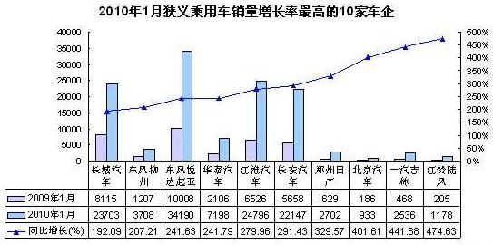 這10家企業(yè)分別為江鈴陸風(指其風華、風尚、陸風X系)、一汽吉林(指其森雅)、北京汽車(指其BJ2020、雷馳、騎士、勇士以及其他SUV)、鄭州日產(chǎn)(指其奧丁、帕拉丁、帥客、御軒)、長安汽車(指其奔奔、杰勛、悅翔、志翔)、江淮汽車(指其賓悅、和悅、瑞風、瑞鷹、同悅)、華泰汽車(指其圣達菲和特拉卡)、東風悅達起亞(指其福瑞迪、SOUL、嘉華、千里馬、銳歐、賽拉圖、獅跑、遠艦)、東風柳州(指其風行、景逸、菱智)、長城汽車(指其哈弗、哈弗M1、嘉譽、精靈、酷熊、凌傲、賽弗、賽影、炫麗),增長率分別為474.63%、441.88%、401.61%、329.57%、291.43%、279.96%、241.79%、241.63%、207.21%、192.09%。