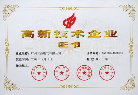 熱烈慶祝廣州三晶電氣有限公司榮獲由廣東省科技廳、廣東省財政廳、廣東省國家稅務(wù)局、廣東省地方稅務(wù)局于2009年12月聯(lián)合頒發(fā)的“高新技術(shù)企業(yè)”證書。