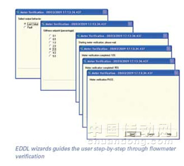 電子設(shè)備描述語言(EDDL)使所有支持EDDL的控制系統(tǒng)都能進(jìn)行智能儀表自校驗,如今常用的控制系統(tǒng)都已安裝了由流量計廠商提供的EDDL使用向?qū)В植街笇?dǎo)用戶使用,無需任何專門的培訓(xùn)就可以進(jìn)行儀表自校驗,工作完成百分比直接顯示在屏幕上,提示技術(shù)人員等待的時間。
