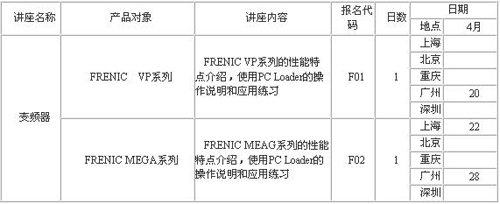 導語:為了提高大家對富士電機的產品的理解和更好地使用富士電機產品的各種功能,富士電機開辦了免費FA講座。本文是2010年4月份的FA講座的日程表。