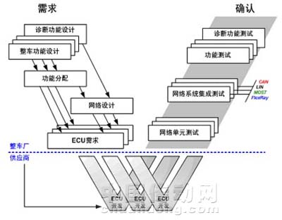 網(wǎng)絡(luò)平臺(tái)構(gòu)建和網(wǎng)絡(luò)系統(tǒng)開(kāi)發(fā)采用V模式開(kāi)發(fā)流程,如下圖所示。V模式定義了一套清晰有效的開(kāi)發(fā)流程:整車廠從系統(tǒng)需求到部件需求,完成系統(tǒng)需求規(guī)范和部件需求規(guī)范的制定,并將部件需求規(guī)范下達(dá)給供應(yīng)商;供應(yīng)商完成部件開(kāi)發(fā)后,整車廠再?gòu)牟考y(cè)試到系統(tǒng)測(cè)試,在多輪樣件和樣車上完成集成和驗(yàn)證。