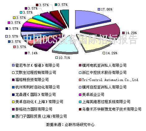 2009年我國(guó)DCS設(shè)備國(guó)際招標(biāo)中共有近20家代理商參與,項(xiàng)目量最多的是霍尼韋爾(香港)有限公司,其項(xiàng)目量占比09年度總項(xiàng)目量的17.86%,其次是橫河電機(jī)亞洲私人有限公司以及艾默生過程控制有限公司,項(xiàng)目量占比相同,為14.29%。產(chǎn)品中標(biāo)數(shù)量上,艾默生過程控制有限公司領(lǐng)先,數(shù)量超過10臺(tái)。