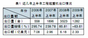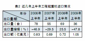 滑62.34%,由于履帶起重機市場對出口的依賴度遠遠大于汽車起重機,履帶起重機上半年出口約70臺,同比下降82%。并且二季度形勢比一季度更為嚴峻,且出口額的下滑并沒有得到遏制。國際金融危機對工程起重機進出口貿易的影響尚未見底,短期內工程起重機出口將持續(xù)萎靡不振。