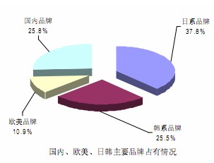 品牌占有率中合(獨(dú))資品牌合計(jì)銷(xiāo)售量為44535臺(tái)(同期減少1577臺(tái)),市場(chǎng)份額為74.15%,比2008年同期下降3.3個(gè)百分點(diǎn),國(guó)內(nèi)品牌銷(xiāo)售量為15520臺(tái)(同期增加2112臺(tái)),市場(chǎng)份額為25.85%,比2008年同期上升3.3個(gè)百分點(diǎn)。