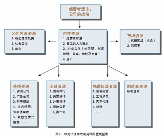 本模型圖把代理商應(yīng)該支配的戰(zhàn)略資源進(jìn)行分類:一是內(nèi)部資源,包括經(jīng)營者智慧、員工的人力資本、公司文化和資產(chǎn)等;二是外部資源,包括市場資源、制造商資源、關(guān)聯(lián)領(lǐng)域資源、金融資源、外腦資源和公共關(guān)系資源等。
