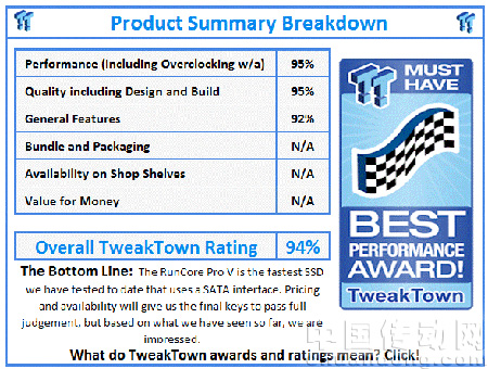 雖然這只是RunCore早期的樣品盤,但可以很自信的宣布使用SandForce 1500控制器和低成本的MLC flash的源科PRO V是一款速度非??斓墓虘B(tài)驅(qū)動器, PRO V將是SSD的愛好者在2010年上半年最好的談資與追逐對象。單純的測試數(shù)字并不能完全顯示出PRO V的真正潛力,一旦與Windows在軟件層上得到更好的結(jié)合,將會是給人帶來更大的驚喜。